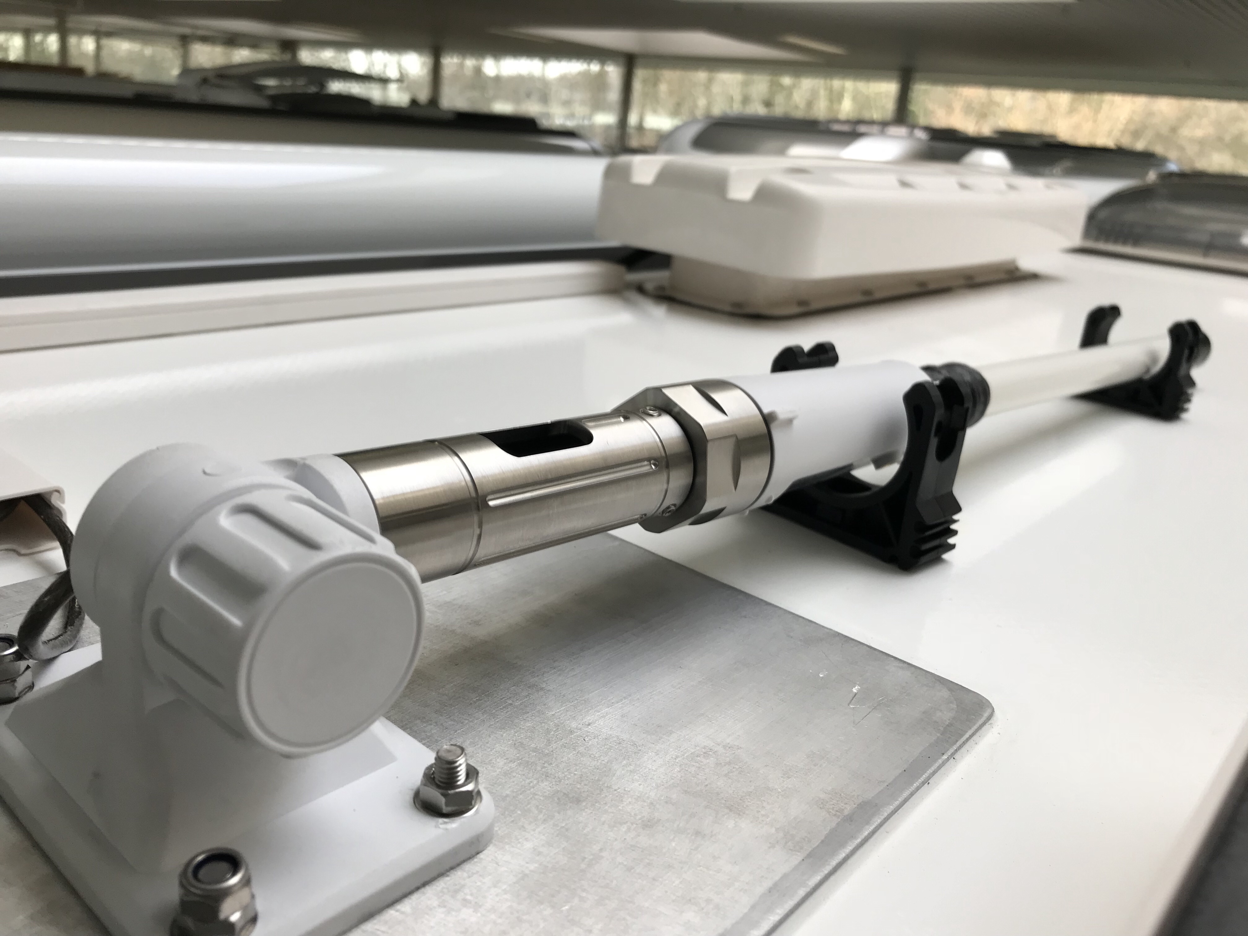 Damit ich keine Löcher im Dach habe, wurde eine 20*30 cm Aluplatte genutzt auf der mit senkkopfschrauben die Antennenhalterung befestigt wurde. Die Aluplatte wurde dann mit Silka Flex auf das Dach geklebt. Das USB Kabel für die Antenne habe ich durch die Lüftung des Kühlschranks gelegt, somit habe ich weiterhin kein weiteres Loch im Dach.